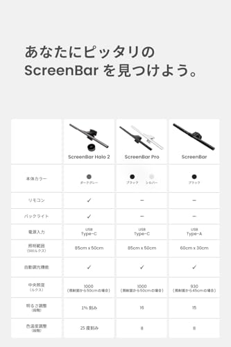 - 暗い環境でのPC作業で目への負担を軽減させる省スペースのモニターライト。細かい調光が可能で見た目も高品質