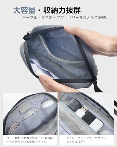 見た目が良く85gと軽量、充電器・モバイルバッテリー・ケーブル・イヤホンケースなどをまとめて入れられて、日常的に持ち運びやすいのでおすすめです。