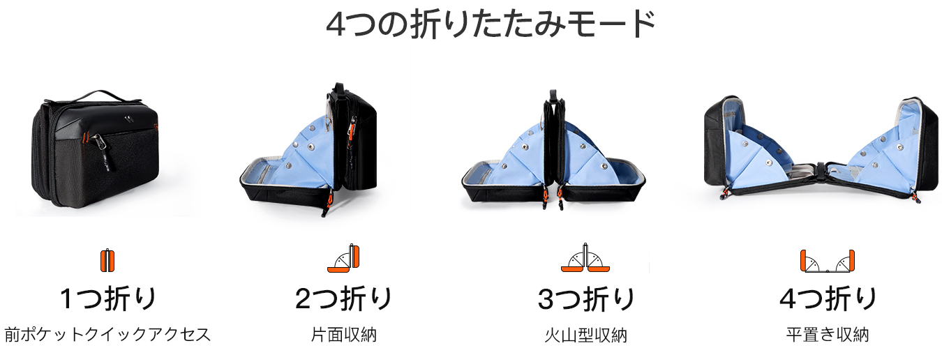4つの折りたたみモードに変形が可能でして、2つの大きな収納ポケットがあるため、片面にはガジェット、もう片面には文具や日用品を入れたりと使い分けが可能です。